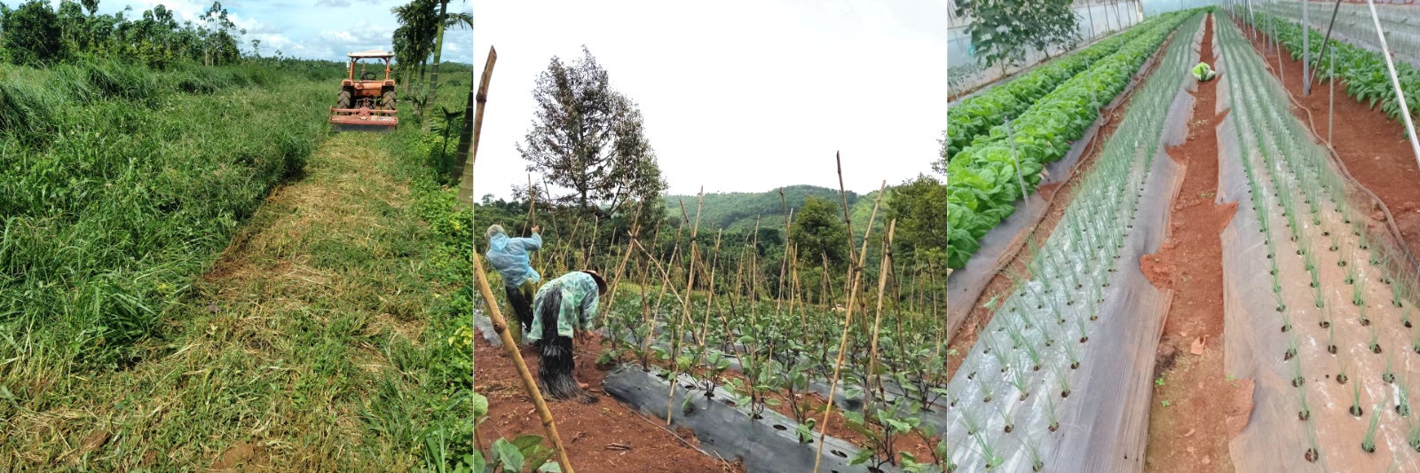 (Trái) Công việc phát quang trên đất bỏ hoang, (Giữa) Lắp dựng giá đỡ cho ruộng cà tím (Phải) Thử nghiệm trồng rau ăn lá
