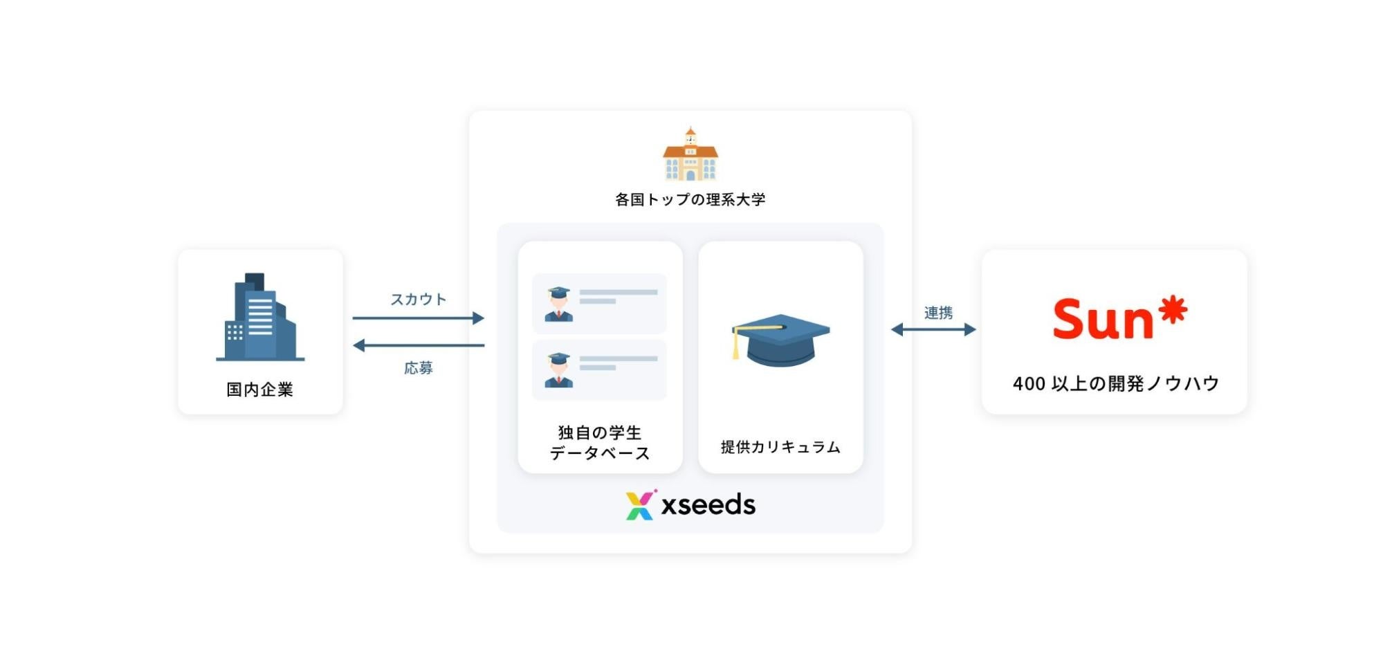 Xseeds là dự án giáo dục nhằm phát hiện, đào tạo và phân bổ tài năng toàn cầu. Kể từ năm 2014, Sun * đã kế thừa "HEDSPI" - được thành lập bởi Trường Đại học Khoa học và Công nghệ Hà Nội và JICA. Đào tạo nguồn lực công nghệ trong khoảng thời gian 4 ~ 5 năm thông qua khóa đào tạo chuyên ngành. Ngoài lập trình, Sun* cũng kết hợp bí quyết học tiếng Nhật thực tế vào chương trình giáo dục nhằm bổ trợ tìm việc sau khi tốt nghiệp cho học viên.