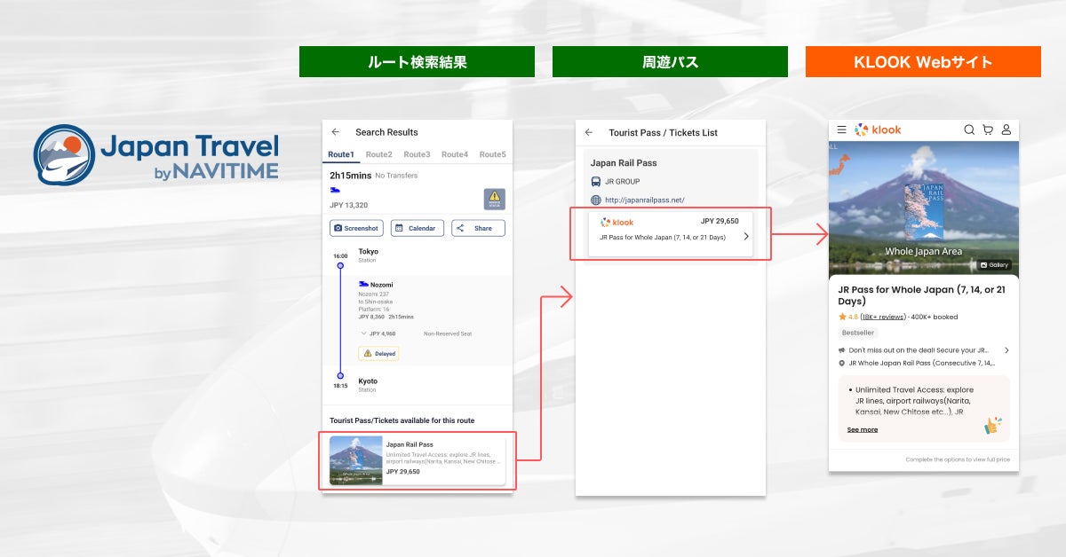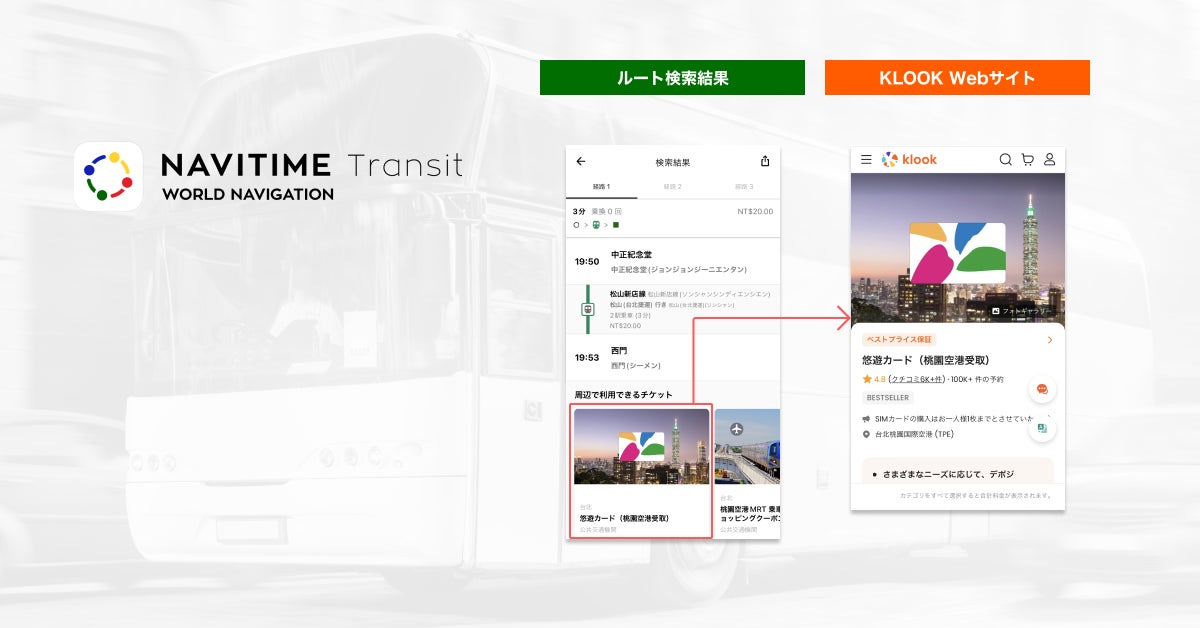 "Japan Travel by NAVITIME" và "NAVITIME Transit" cung cấp thẻ tham quan đường sắt như "Japan Rail Pass" và "Osaka Amazing Pass" trên Klook. Đồng thời, "NAVITIME Transit" cung cấp dịch vụ du lịch nước ngoài với khoảng 700 sản phẩm, bao gồm thẻ giao thông công cộng, dịch vụ đón tại sân bay, Wi-Fi và và các dịch vụ đón tại sân bay như thẻ SIM.