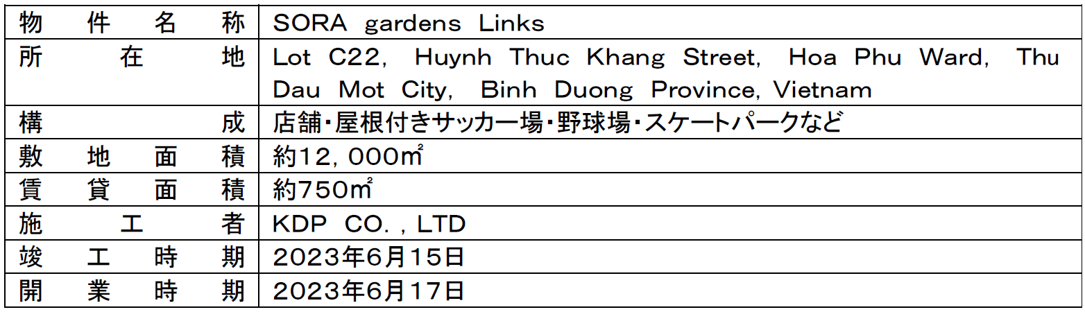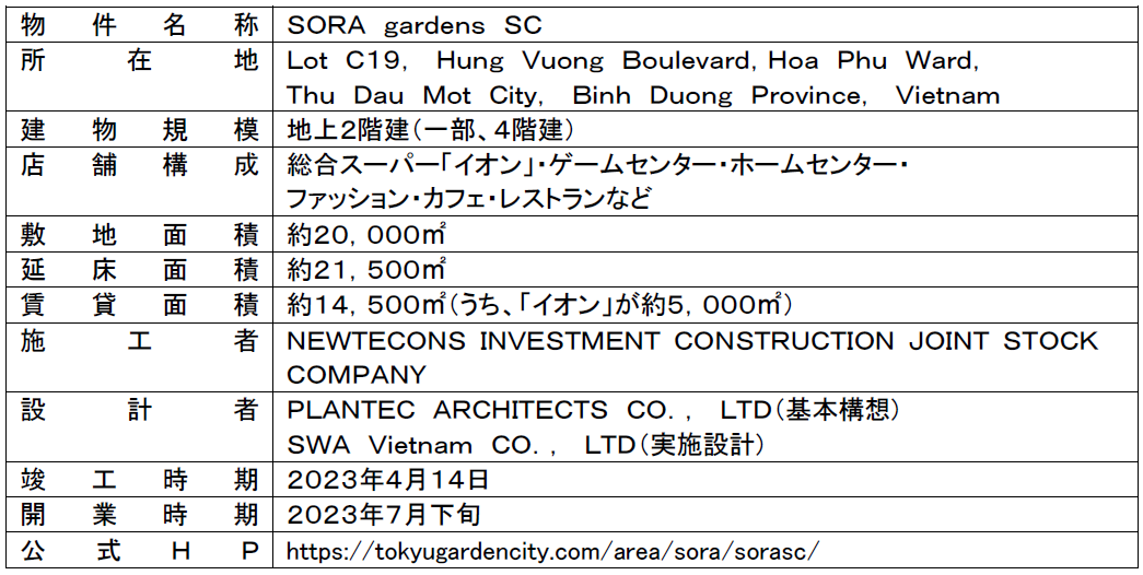 CÔNG TY TNHH BECAMEX TOKYO, công ty con của Tập đoàn Tokyu. , LTD. (sau đây gọi là Becamex Tokyu) sẽ khai trương trung tâm thương mại đầu tiên “SORA gardens SC” (sau đây gọi là cơ sở này) tại Thành phố mới Bình Dương, thủ phủ của tỉnh Bình Dương, vào cuối tháng 7.