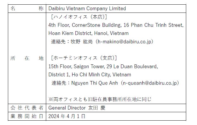 Theo kế hoạch của Daibiru Corporation của Nhật Bản, họ đã dần dần giải thể các văn phòng đại diện tại Hồ Chí Minh và Hà Nội và quyết định thành lập một công ty con tại Việt Nam.