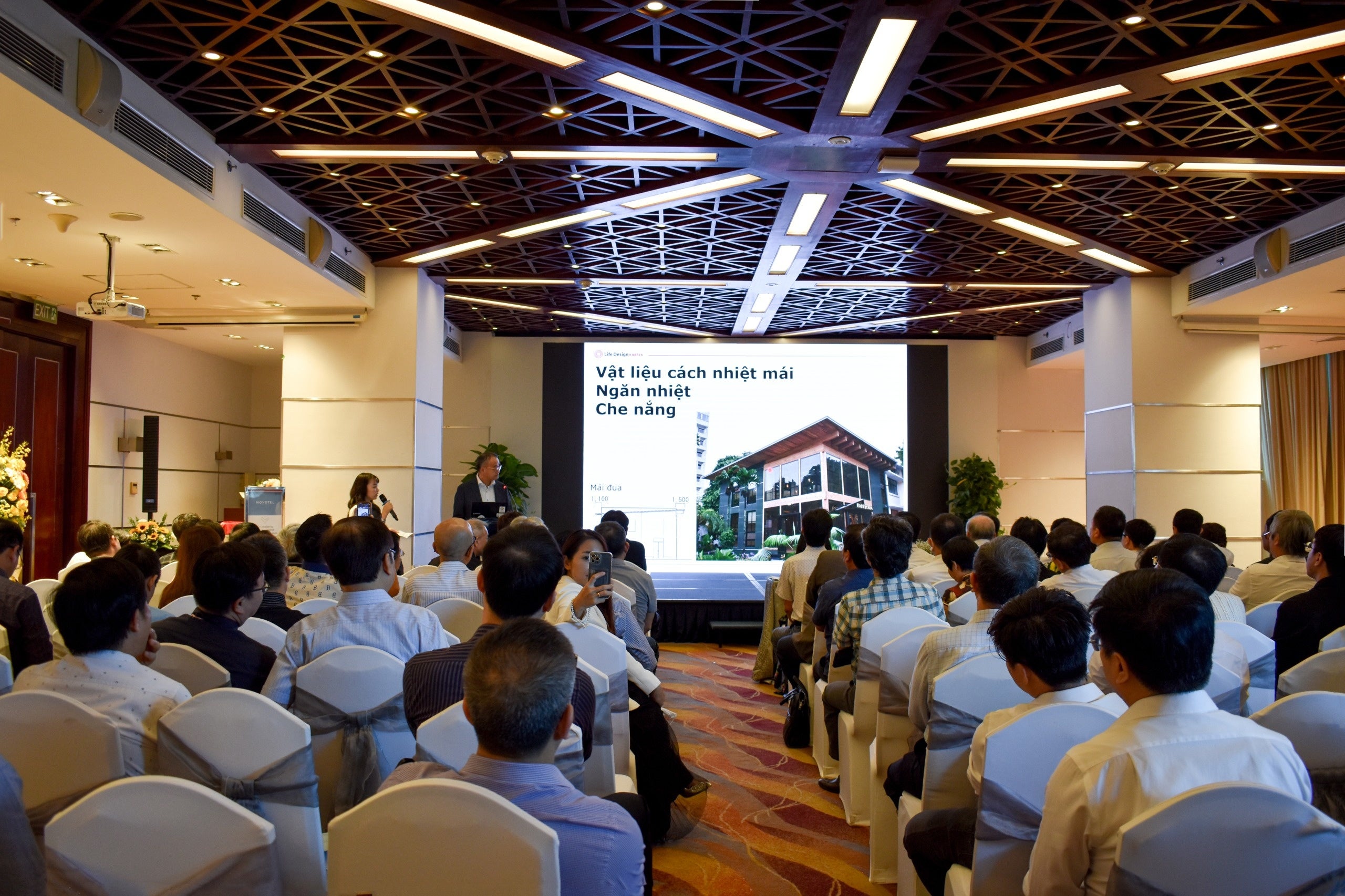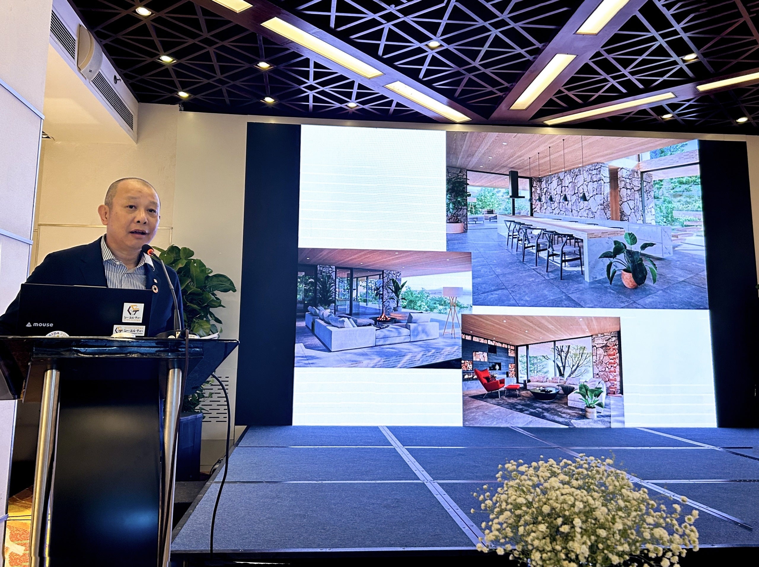 Cùng ngày, tại cùng địa điểm, Giám đốc điều hành phụ trách kinh doanh quốc tế Yoshihiko Yamaoka và giáo sư Takuro Mori từ Đại học Hiroshima, chủ tịch Ủy ban Xem xét Mô hình Kết cấu Khung gỗ Phù hợp với Việt Nam, đã tham gia hội thảo.